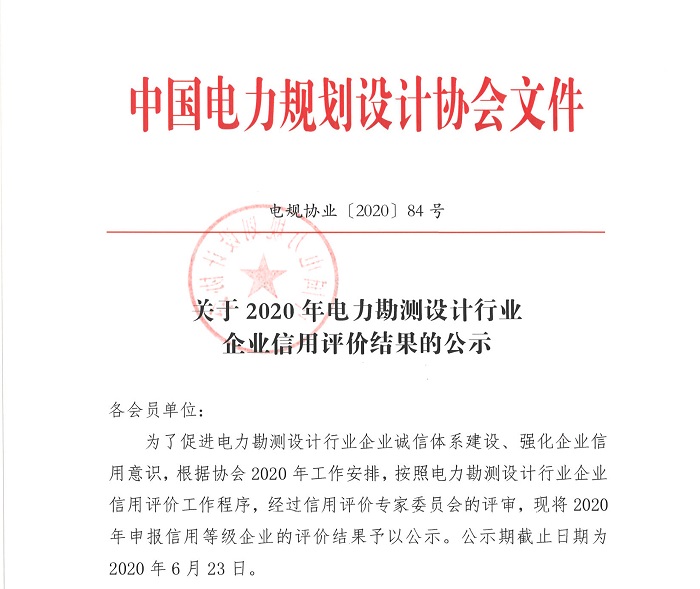 近日,中國電力規(guī)劃設計協(xié)會下發(fā)《關于2020年電力勘測設計行業(yè)企業(yè)信用評價結果公示》(電規(guī)協(xié)業(yè)[2020]84號)文件,我公司在首次參報的“2020年電力勘測設計企業(yè)行業(yè)信用評價”中,榮獲AA級信用評價等級,可喜可賀!